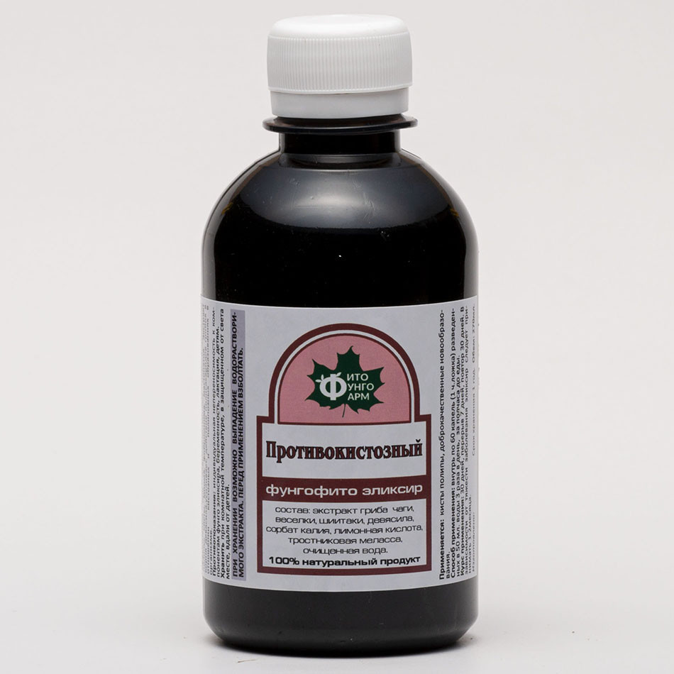 Применение Фунгофито эликсира «Противокистозный» (кисты полипы) : кистозные образования в груди, на яичниках; образование полипов в кишечнике, матке. Так же доброкачественных образований- миома, эндометриоз, мастопатия.