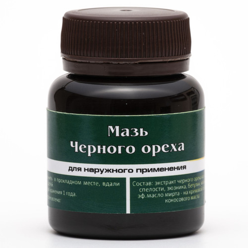 Чёрный орех в первой десятке лекарственных растений с противоопухолевым действием. Мазь эффективно рассасывает различные новообразования. При этом снимая воспаления и раздражения кожного покрова, содержит большой процент природного йода.