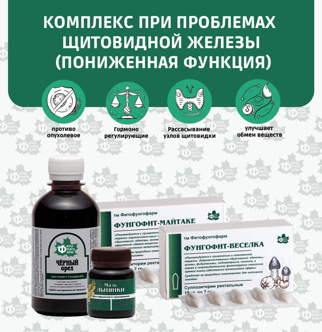 Способ применения: На ночь перед сном, вскрыть свечу «Веселка» от оболочки и ввести в прямую кишку в течение 3 дней. Следующие три дня на ночь перед сном свеча «Майтаке». И так чередуя по три дня в течение месяца. За 30-15 мин. до еды принять экстракт «жидкий» Черного ореха по схеме. Мазь «Льнянку» наносить на низ шеи (щитовидной железы), не массируя и не создавая тепловых процедур в течение месяца.