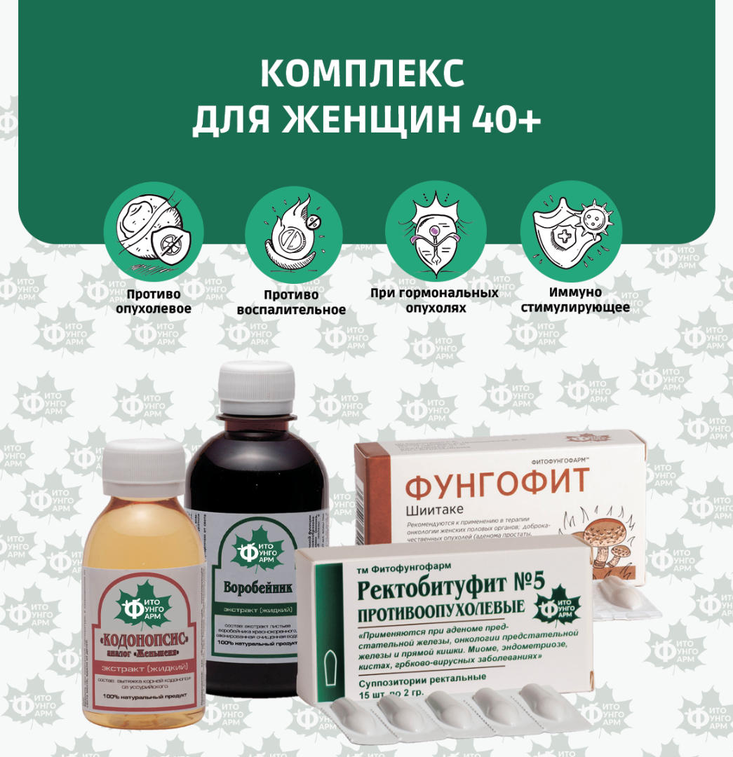 В комплексе применяется настойка "ВОРОБЕЙНИКА", свечи Ректобитуфит №5, свечи Фунго- фит "Шиитаке", настойка "Кодонопсиса"