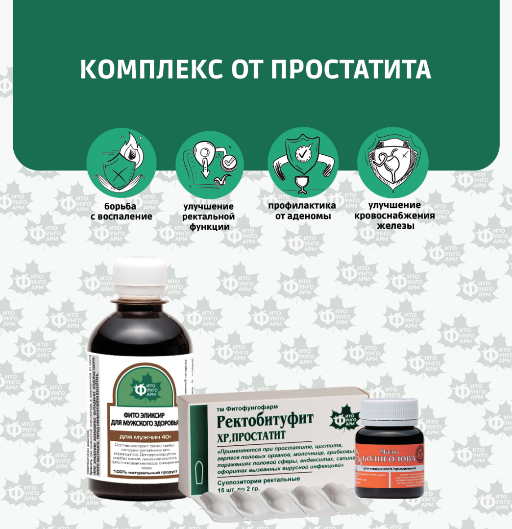 Состав комплекса- эликсир "Для мужского здоровья", свечи "Ректобитуфит №4 , мазь "Болиголова"