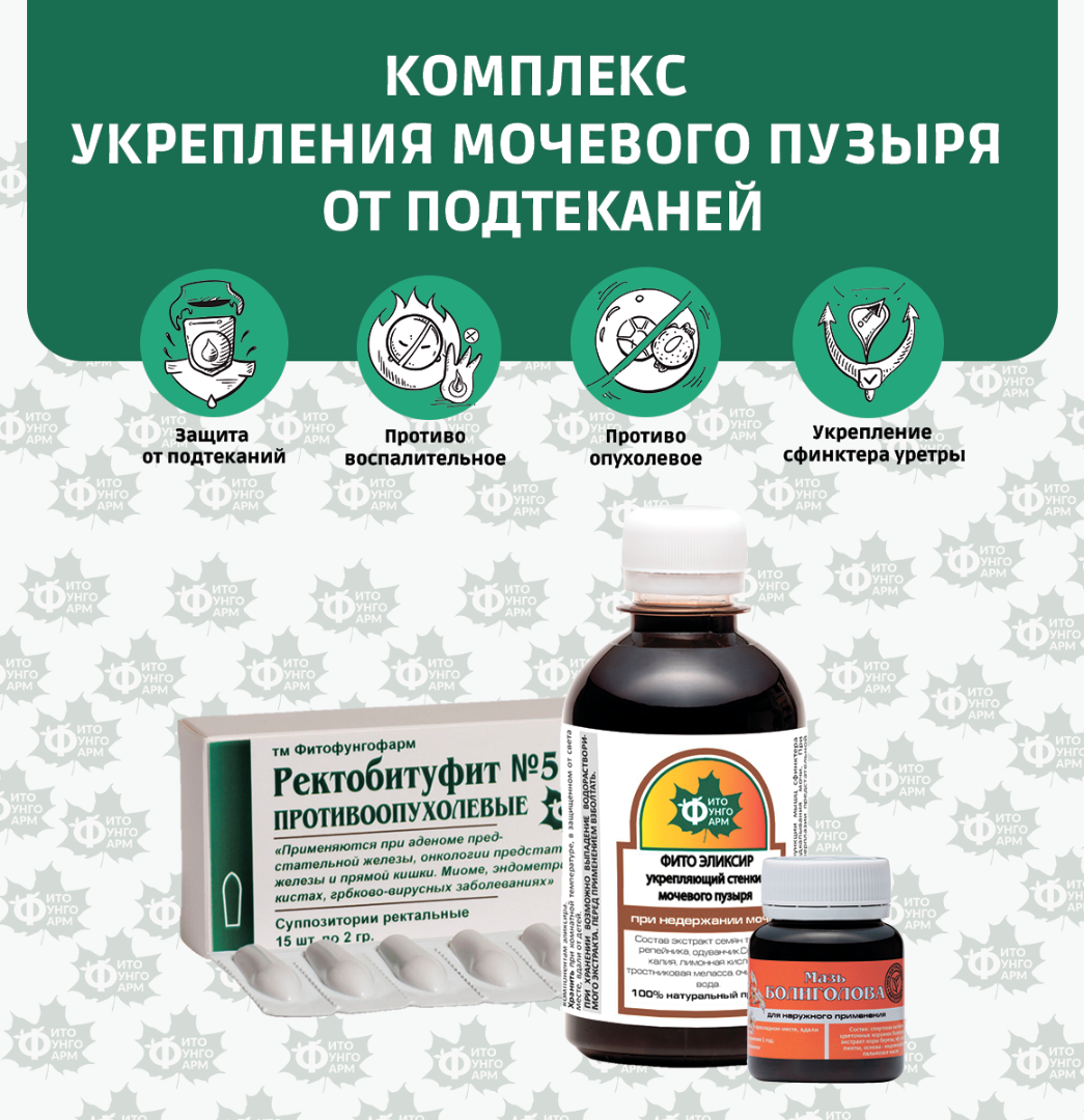 Нами разработан комплекс для поддержки функций мочевого пузыря и мочеиспускания как у мужчин так и у женщин особенно в преклонном возрасте. Так как подтекания мочи, как правило на фоне, доброкачественных новообразований, то мы предлагаем в комплексе свечи «Ректобитуфит», и мазь Болиголова, что в комплексе решает сразу несколько задач.