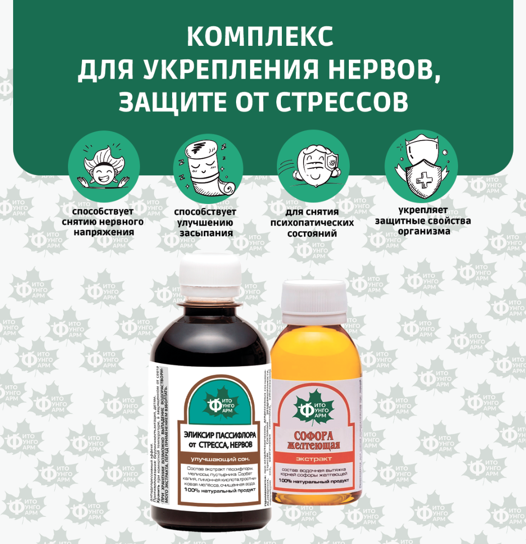 Нами разработан уникальный комплекс в который входит «Эликсир от стресса и нервов» и экстракт (жидкий) «Софора Желтеющая». Фито-эликсир — это натуральное средство, созданное на основе растительных экстрактов. Оно помогает организму справляться со стрессом, нервным напряжением, тревогой и бессонницей без вреда для здоровья. Компоненты эликсира комплексно воздействуют на нервную систему, сердечно-сосудистую систему и обмен веществ. "Софора желтеющая" Сильнейшее успокаивающие средство — в десятки раз мощнее валерианы, не вызывает сонливости днем, помогает при перевозбудимости и тревожности, снимает психопатические состояния и бессонницу.